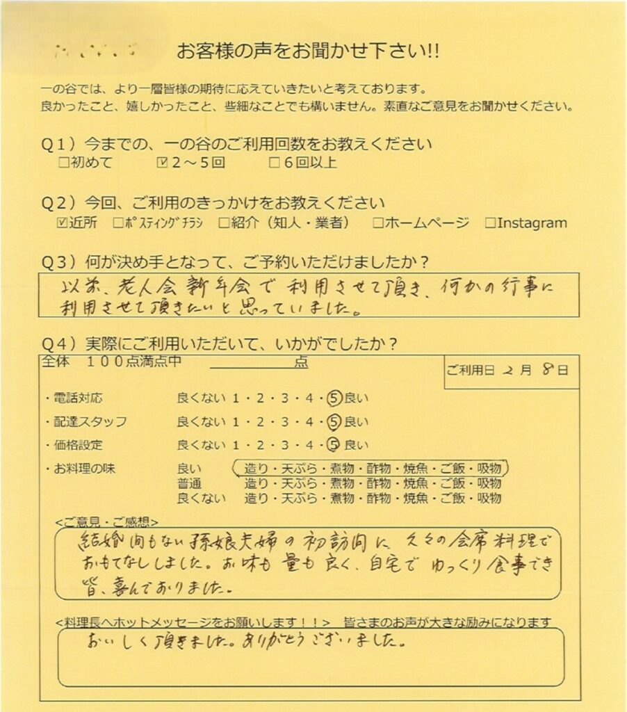 お味も量も良く、自宅でゆっくり食事でき、皆喜んでおりました。