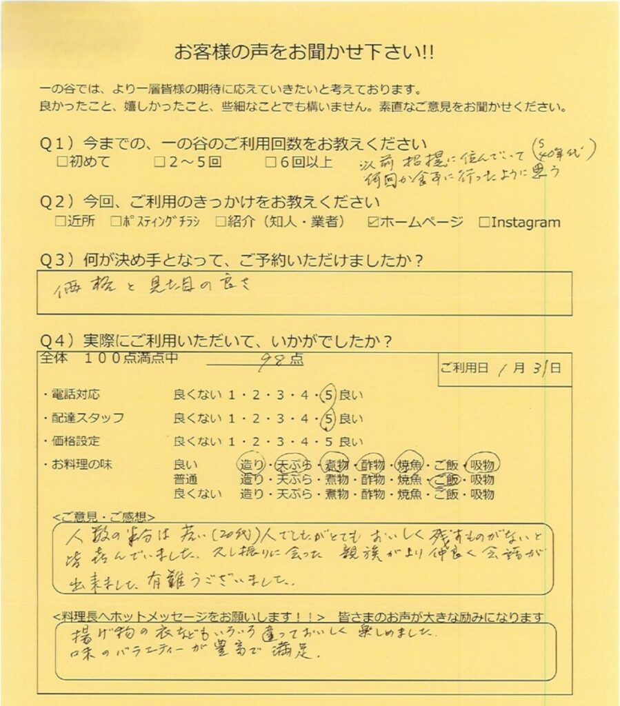 人数の半分は若い(20代)でしたでしたがとてもおいしく残すものがないと皆喜んでいました。久しぶりに会った親族がより仲良く会話ができました。